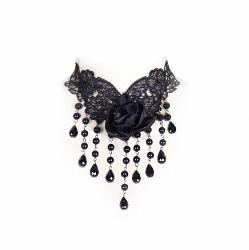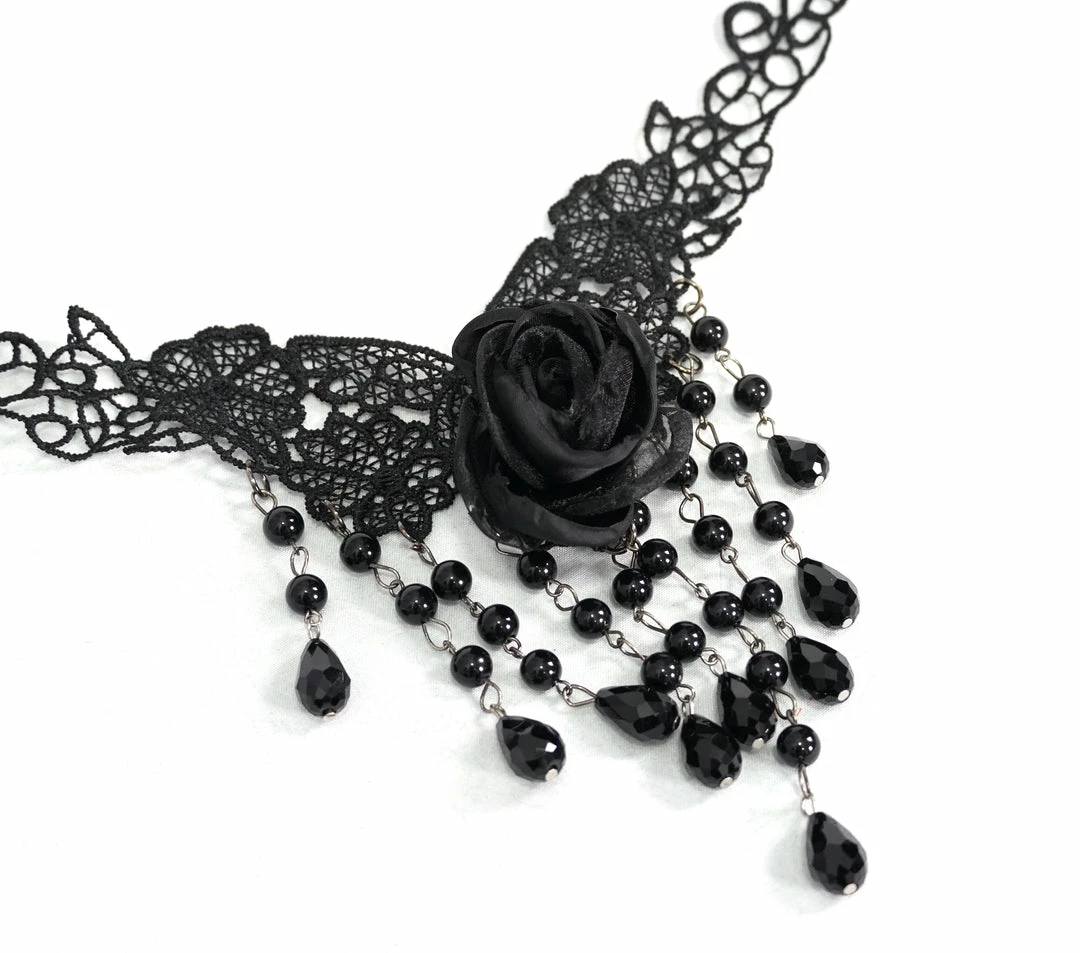 - The V-shaped lace is stitched with roses by hands, the beads chain hung up.