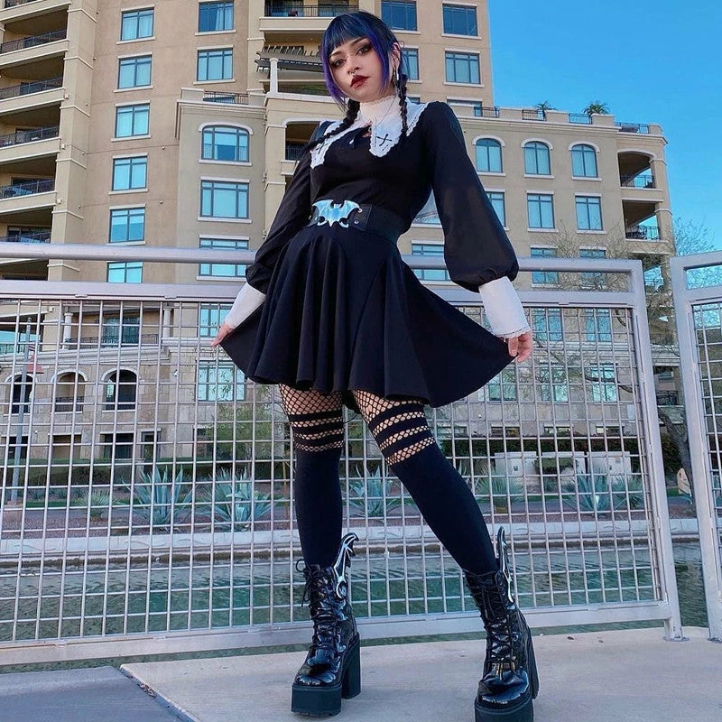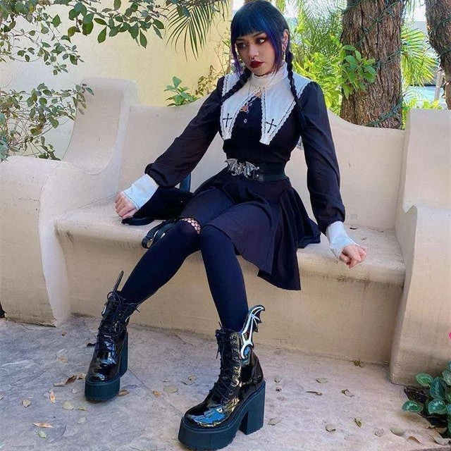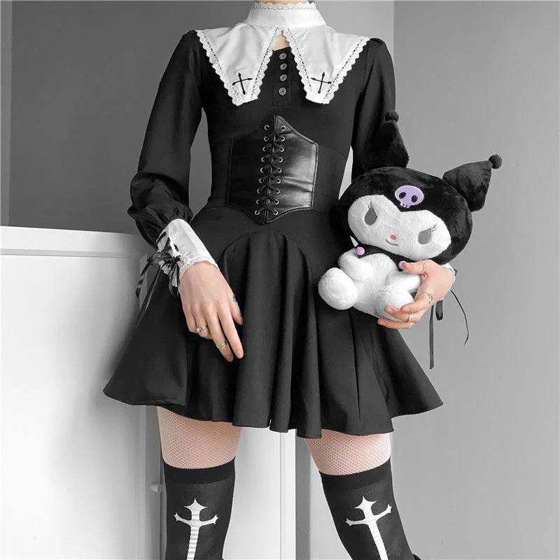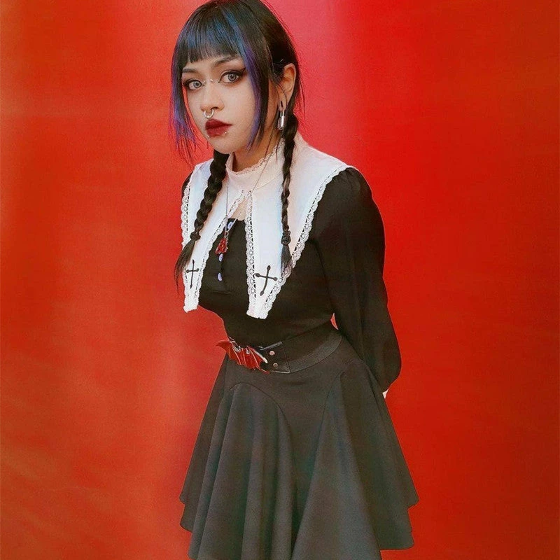 Which sin did you commit today? Make everyone else envious in our 2-Piece High Waist Nun Stretch Dress: conjured using a luxe soft-touch cotton fabric. Features a high o-neck and lacey collar adorned with crosses, lace-up cuffs with long sleeves. A sinful statement piece to transcend your look – bound to make even the satan lord take notice.